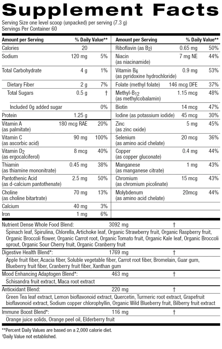- 3X more potent, with 4X more vegetables and fiber, than leading greens products